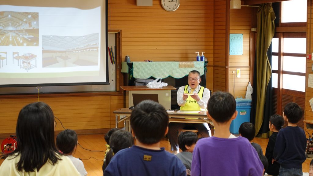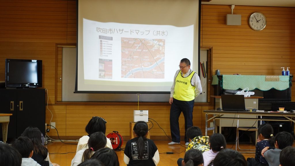 吹田市は小学生を対象に防災教育に力を入れています。4年生の皆さんは、同月11日に市役所の危機管理室を訪問し、避難所設営の実態等の体験学習を含めた一連のカリキュラムが組まれ、基本的な防災知識の習得のために今回の出前授業が実施されました。