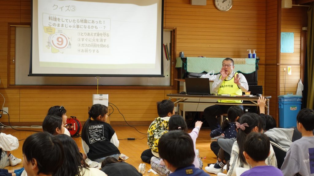 その後は、地震が発生した時どのような行動をとるべきか、クイズ形式で進められました。