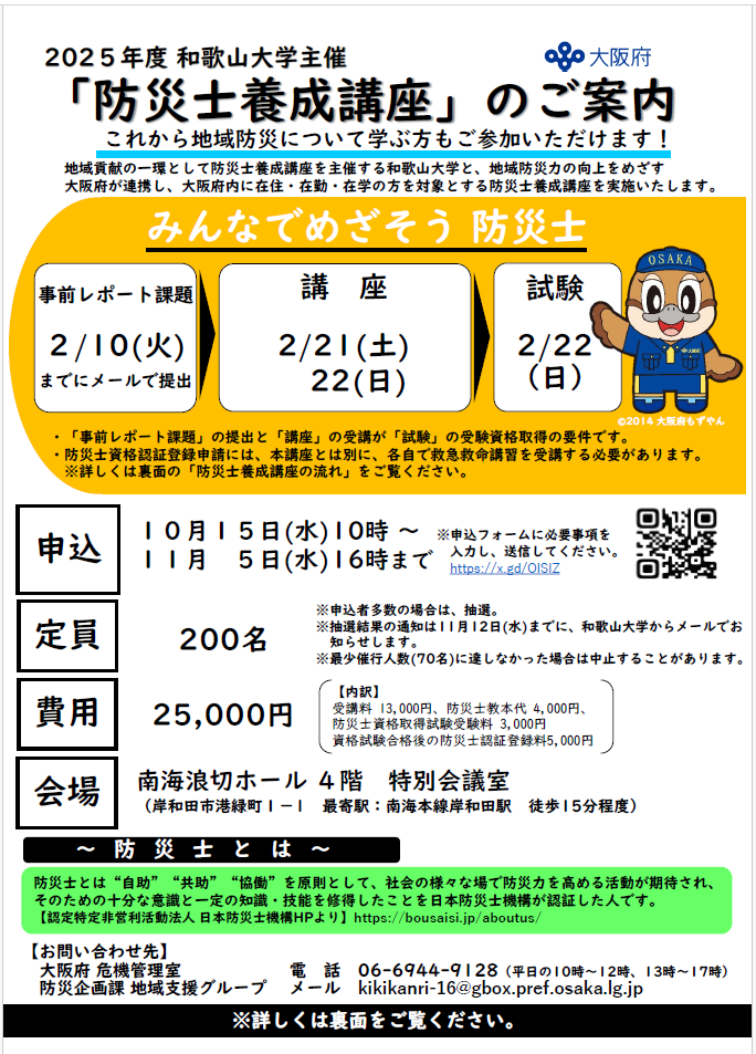 今般、和歌山大学主催の防災士養成講座が、岸和田市の波切ホールにて開催されますので、皆様にご案内いたします。