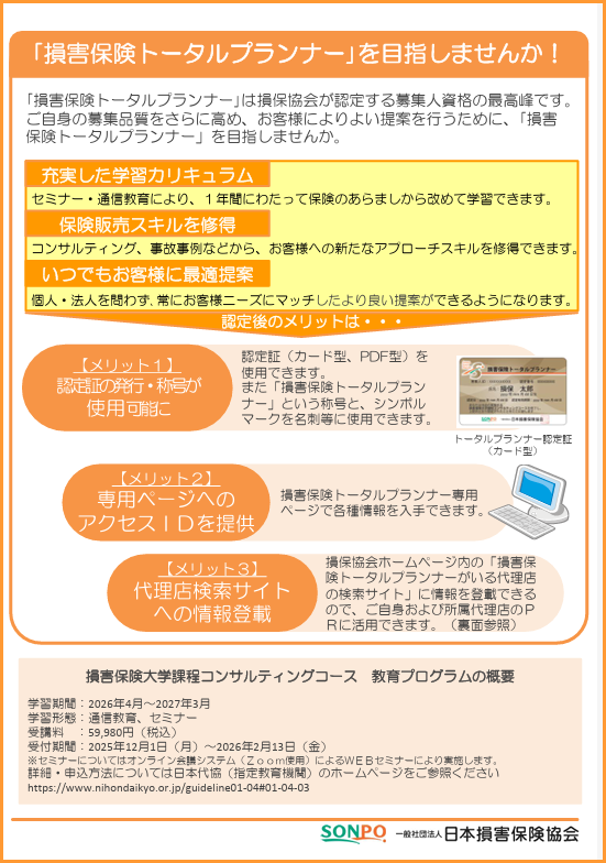 損害保険トータルプランナー資格を取得するための必修課程です。