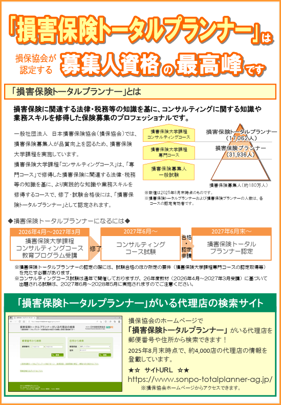 募集人の皆様が一人でも多く、損害保険トータルプランナー資格を取得されますよう取得の奨励をよろしくお願いいたします。