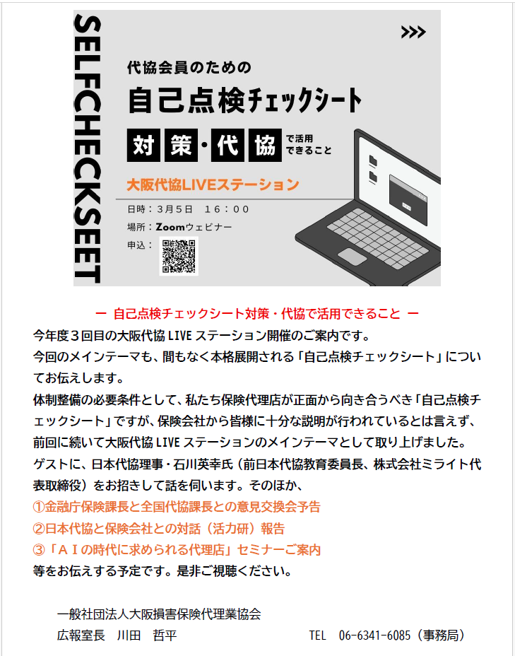体制整備の必要条件として、私たち保険代理店が正面から向き合うべき「自己点検チェックシート」ですが、保険会社から皆様に十分な説明が行われているとは言えず、前回に続き大阪代協LIVEステーションのメインテーマとして取り上げました。